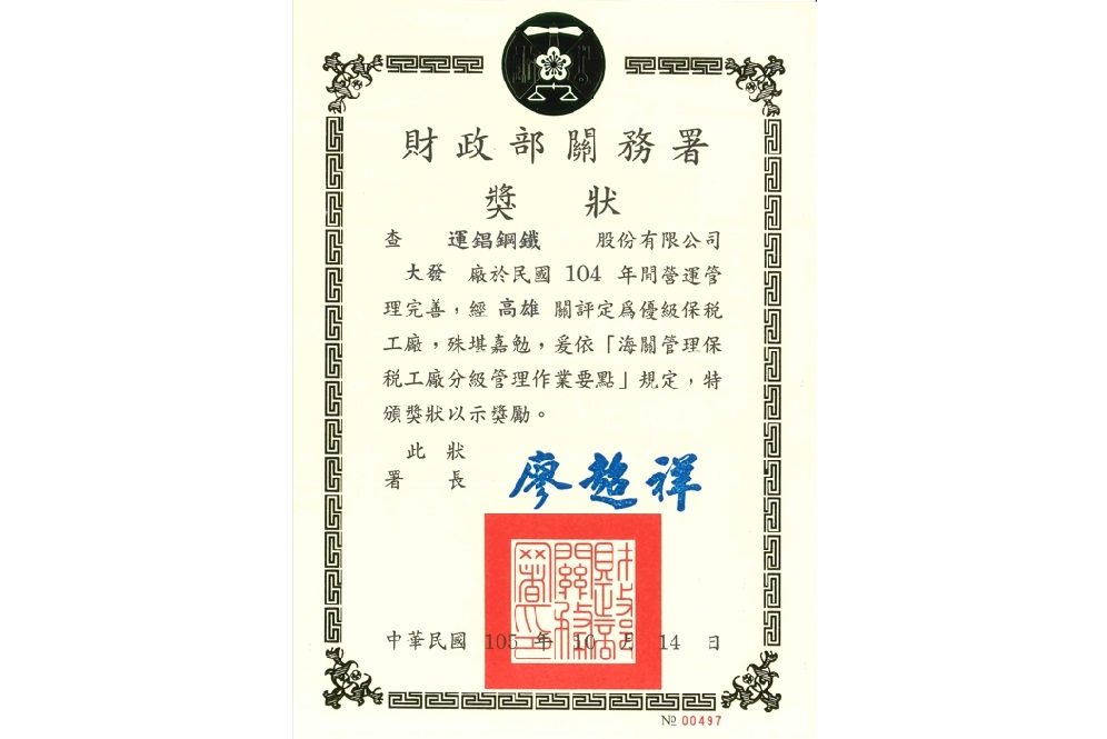 - The Dafa Plant was awarded as “Excellent Bonded Factory” by the Customs Administration, Ministry of Finance in 2015.
